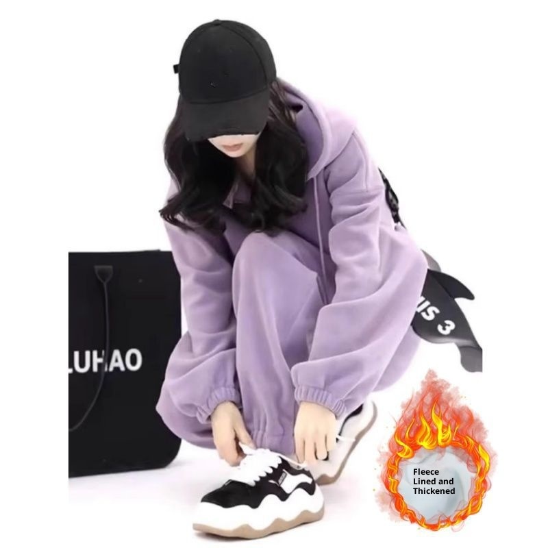 001 Purple Tracksuit Women, Autumn Winter New Loose Slimming Sweatshirt And Sweatpants, Fashionable Casual Two-Piece Set For