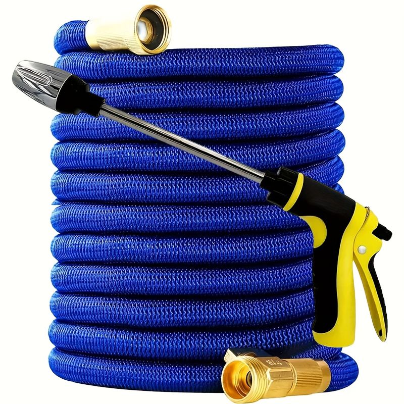 A retractable garden hose set with a high-pressure water gun nozzle and US standard 3/4-inch connectors, perfect for outdoor watering and gardening.