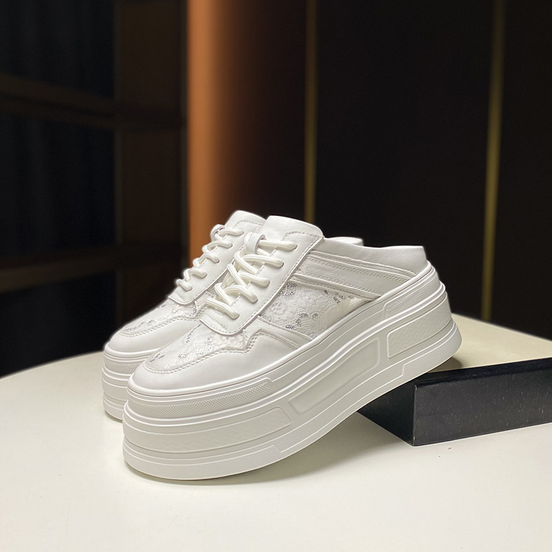 European Goods 2024 Autumn New Item Thick Bottom Leather Toe Cover Half Women's Lace Hollow Breathable Lazy Cool