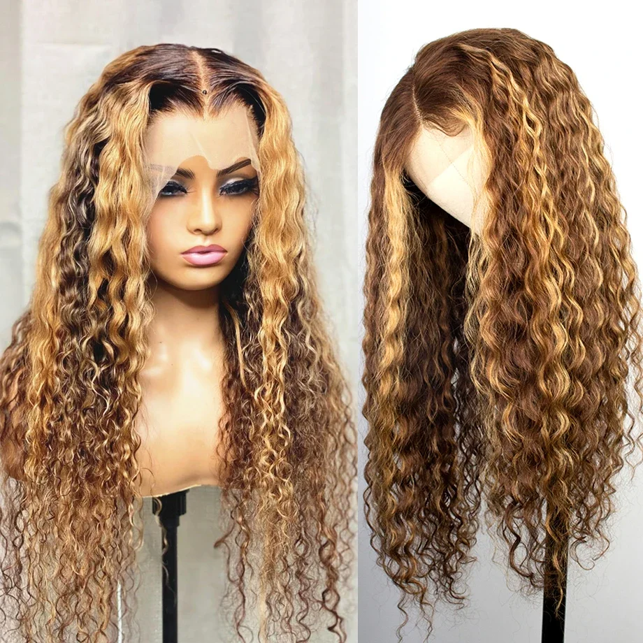 Göndör melírozott paróka emberi hajból, ombre brazil mélyvízi hullámos HD frontális mézszőke csipke eleje paróka