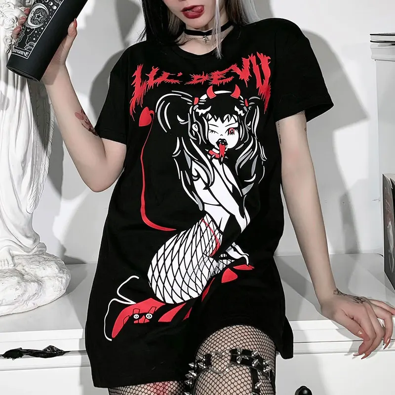 Haruku Women T-shirts Mall Goth Cat Person Print Short Sleeve T Shirt Female Punk Grunge Chic Fashion Woman Blouses 2022 Tops
