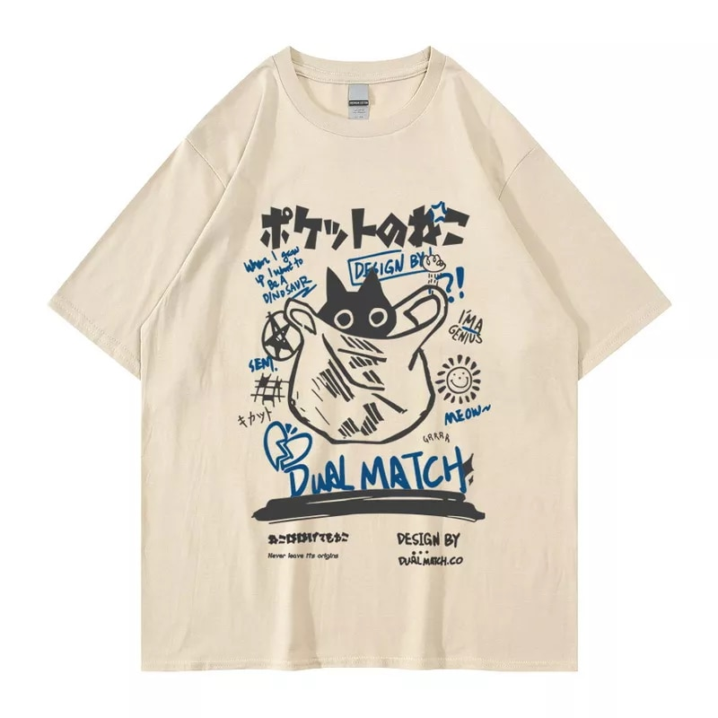 Hip Hop póló Streetwear japán kanji vicces macskás nyomtatott póló 2024 férfi haruku pamut hétköznapi rövid ujjú póló