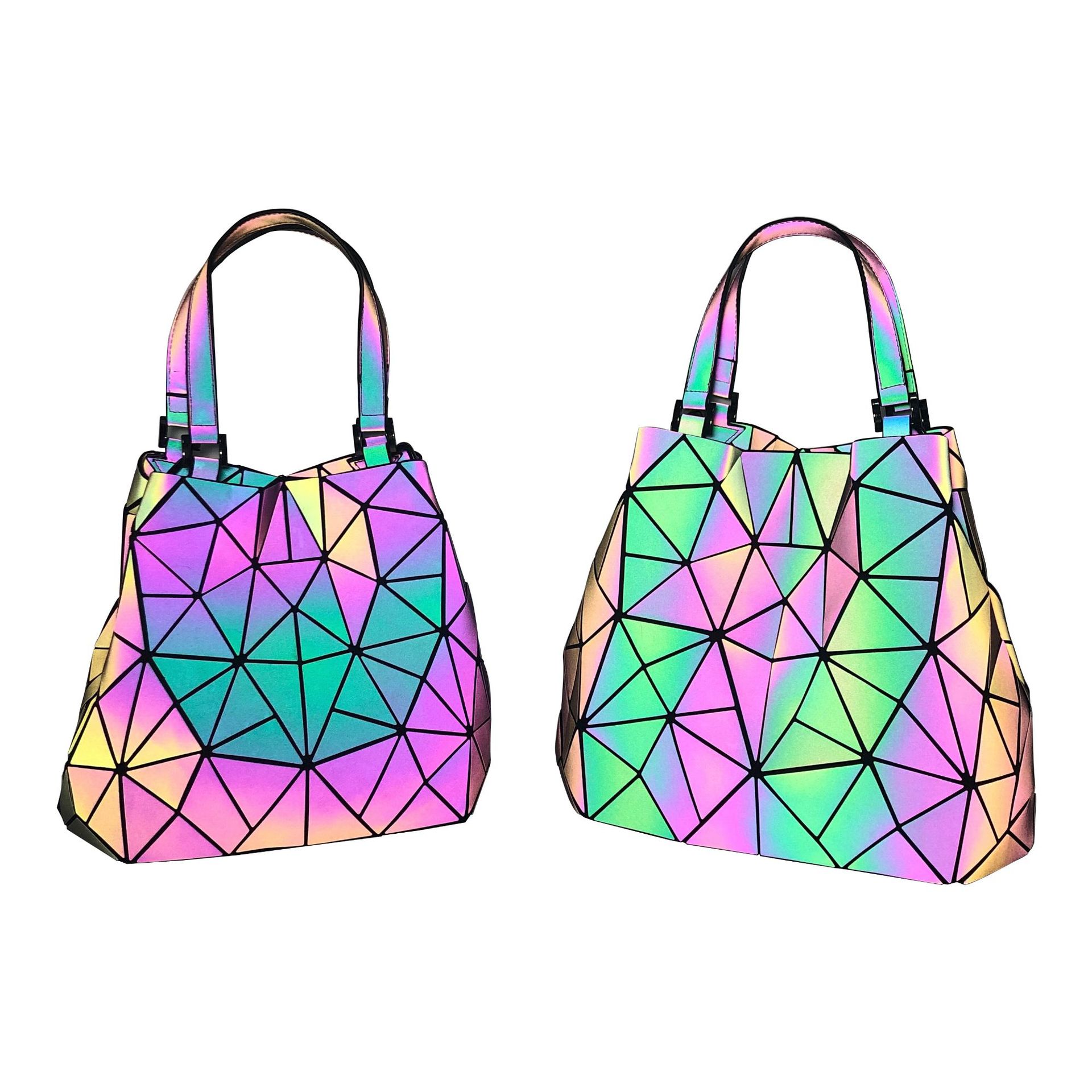 The geometric luminous bags are dark gray in normal light, When illuminated by the light at different angles or distances they will appear in amazing colors. You will like this interesting design.It's a Geometric Tote With a Detachable Strap, Can be Used as a Shoulder Bag and Handbag. It's a Fashion Bags, Flexible All Your Dress, Make You More Fashionable in Party or Date.