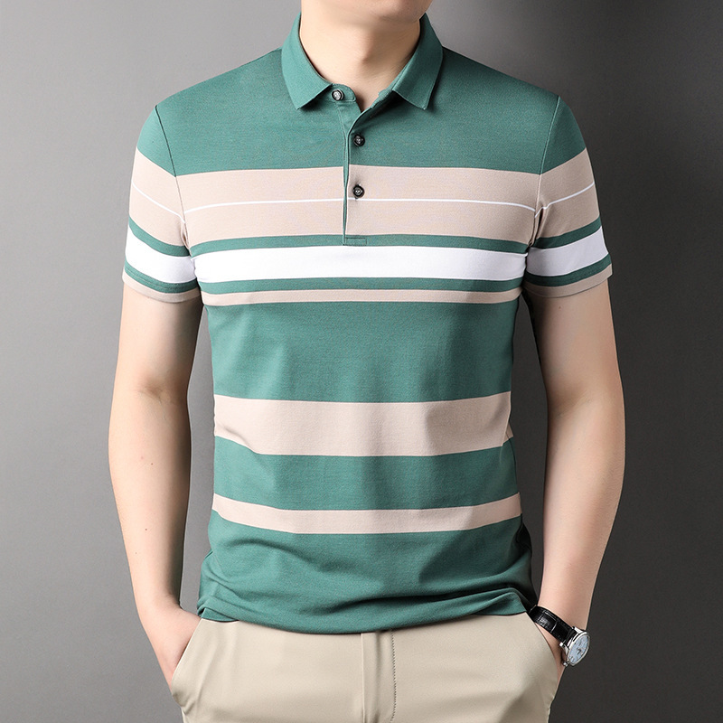 Lin Made 2023 Nyári Vékony Pamutkeverék Színes Szőtt Hajtókás Középkorú Férfi Rövid Ujjú csíkos Póló