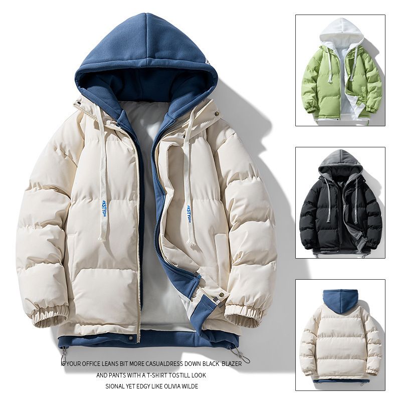 Men's Trendy Cotton Jacket 2023 New Winter Cotton Coat Plus Size Hooded Fake Two-Piece Couple Puffer Jacket
