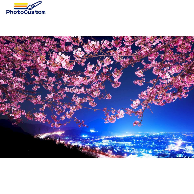 PhotoCustom 5D gyémánt hímzés Gyönyörű városi éjszakai tájkép Gyémántművészeti festmény Cseresznyevirág mozaik kézműves fali dekoráció Otthoni dekoráció