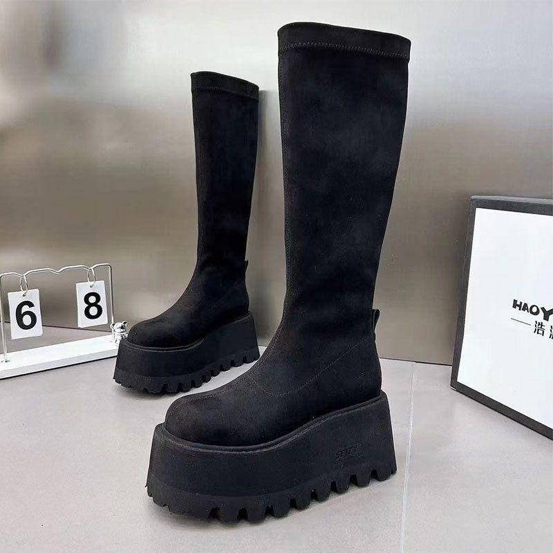 Thick soled height increasing small knight boots 2024 autumn new suede elastic slim sock boots women's knee high boots