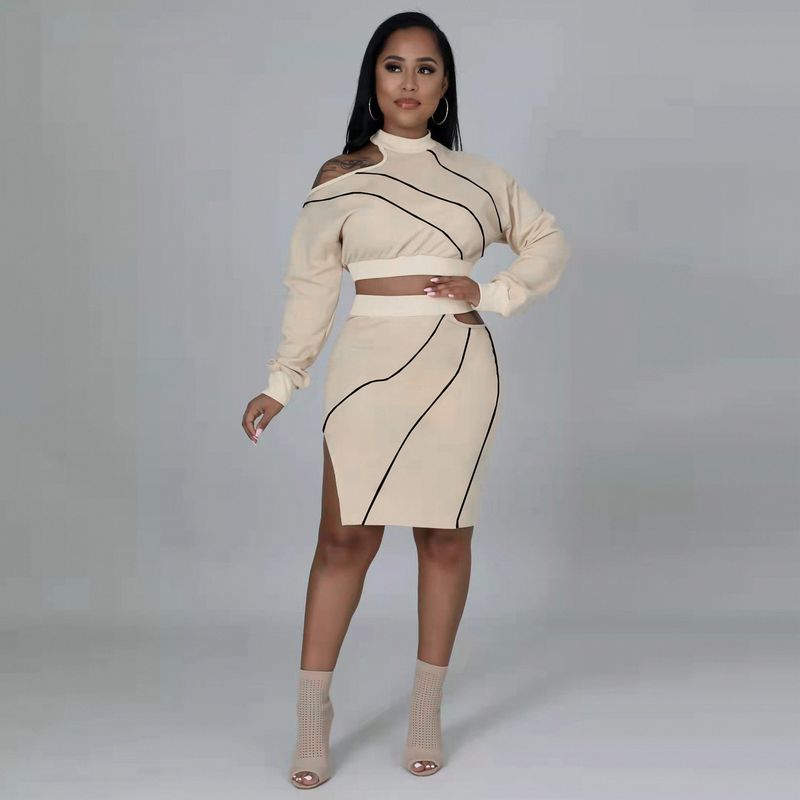 Women's Fashion Reverse Thread Hollow Out Split Round Neck Top And Skirt Two-Piece Set